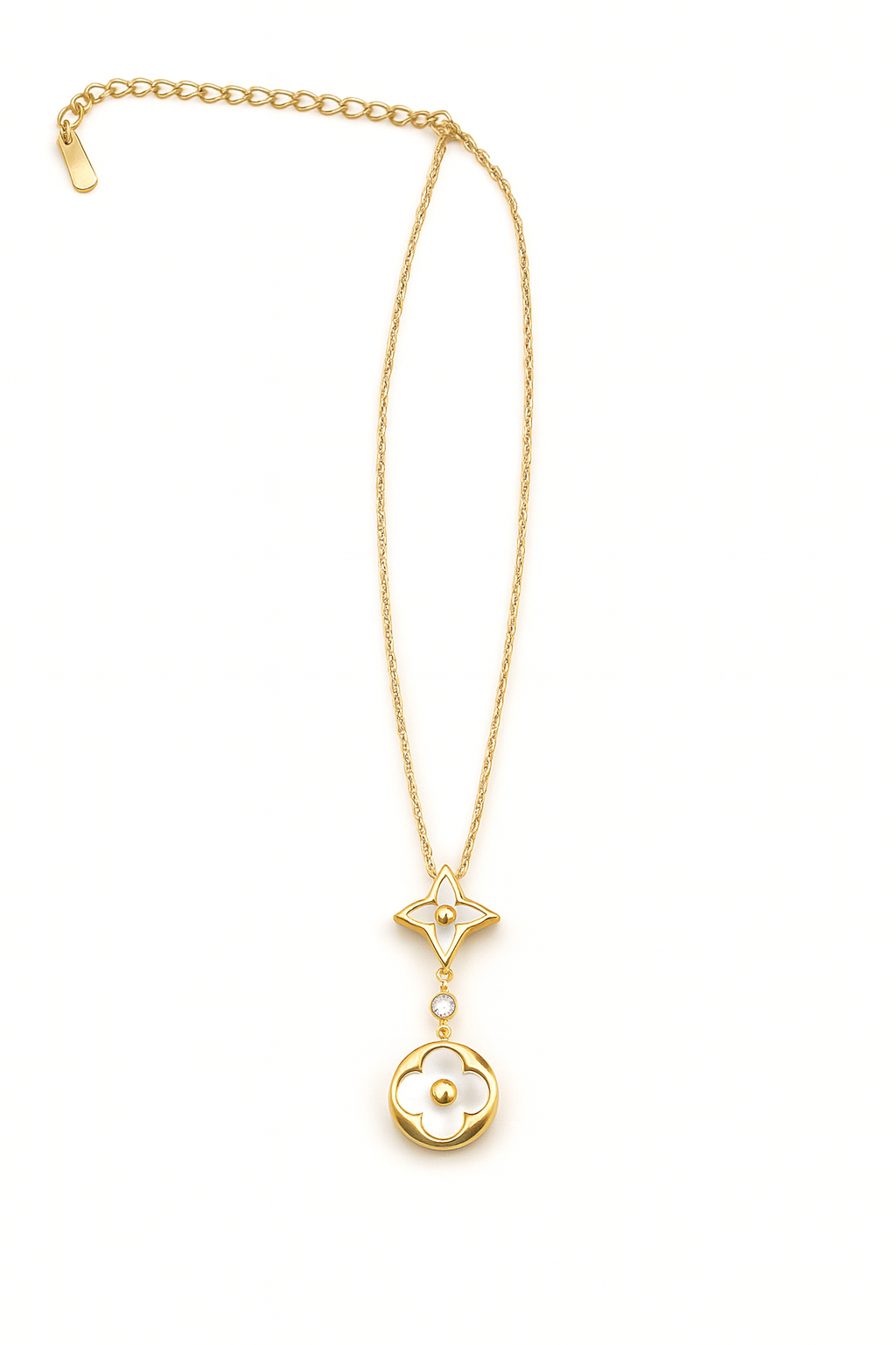 A refined blend of elegance and symbolism — the Astoria Necklace features a delicate star and clover charm, highlighted with white enamel and golden details. A versatile piece that radiates sophistication.