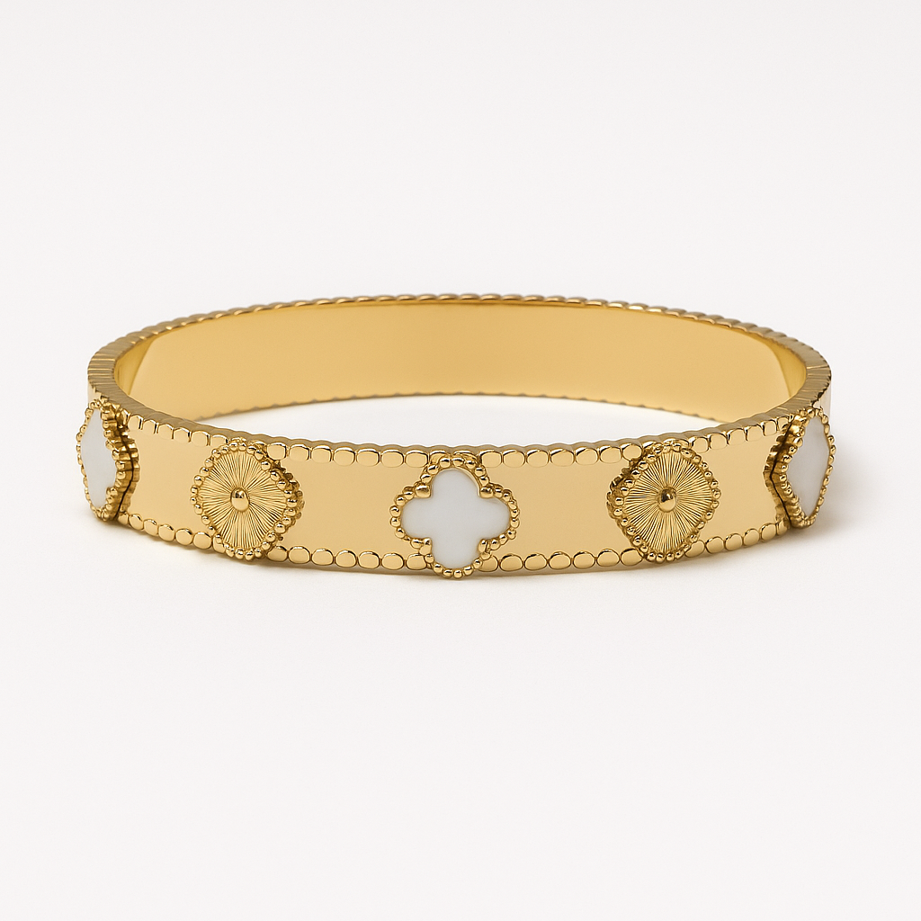 Design: A luminous bangle alternating golden motifs with radiant white clovers, symbolizing purity and timeless beauty.