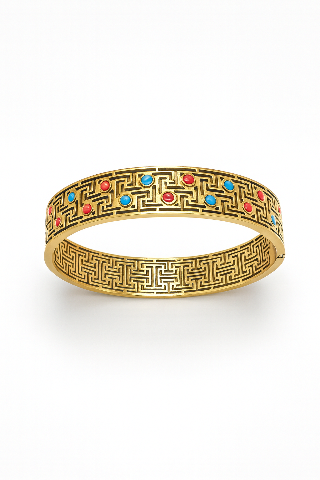 Design: A bold bangle where geometric precision meets colorful artistry, symbolizing harmony within complexity.