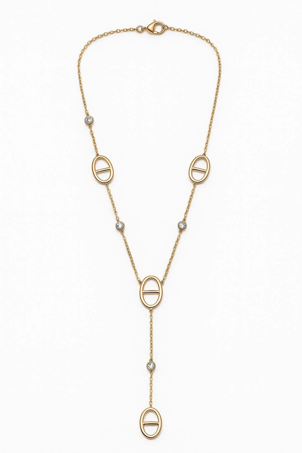 Design: A delicate Y-shaped necklace adorned with open oval links and sparkling crystal accents, creating a perfect balance of geometry and elegance.