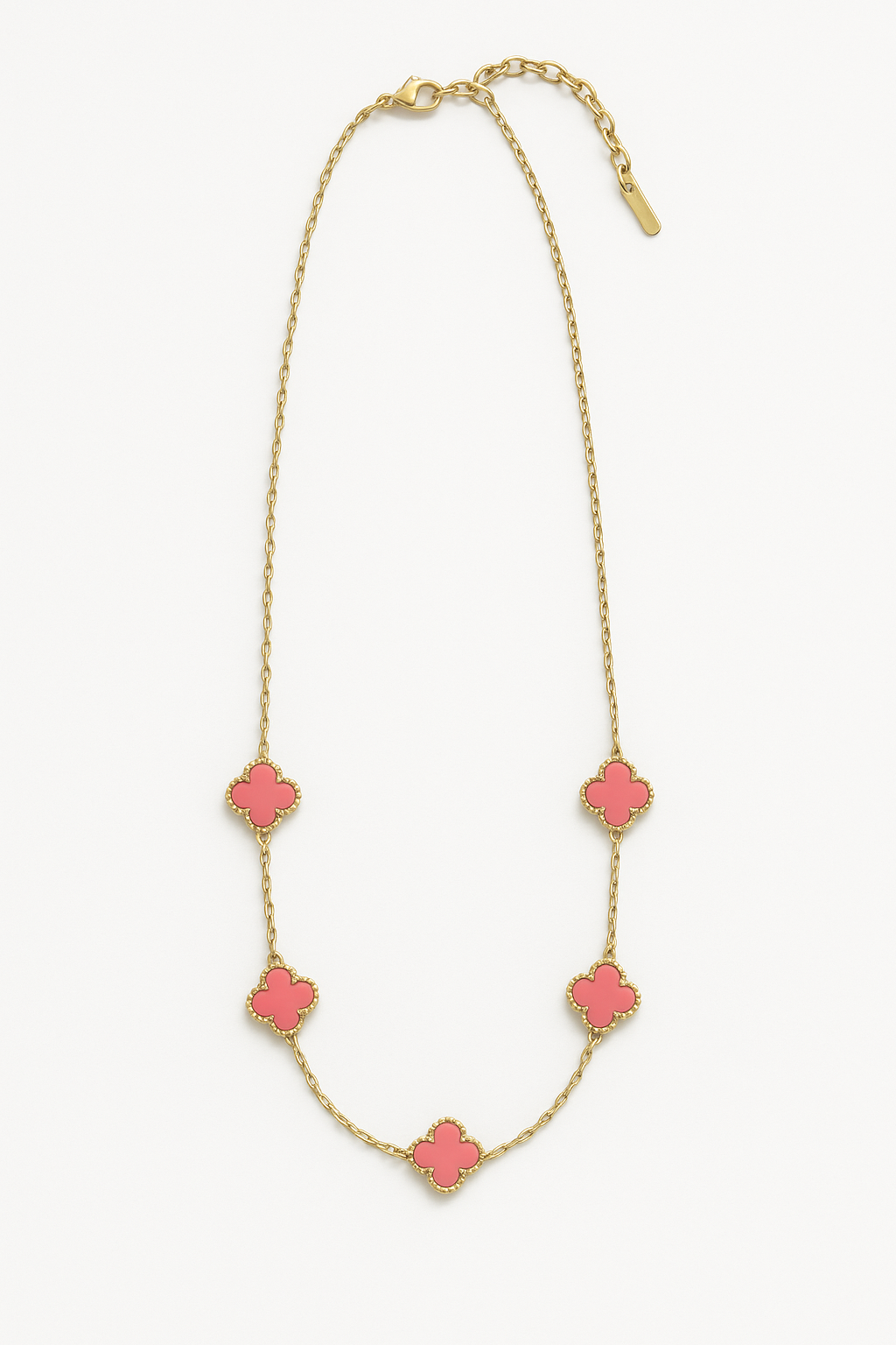Delicate and radiant, the Petite Fortuna Rose Necklace brings a subtle touch of color and charm. Featuring smaller pink clover motifs, this necklace is perfect for those who love elegance with a playful twist.