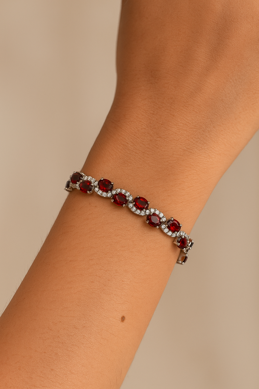 Material: Premium stainless steel with radiant ruby-red crystals and pavé white stones